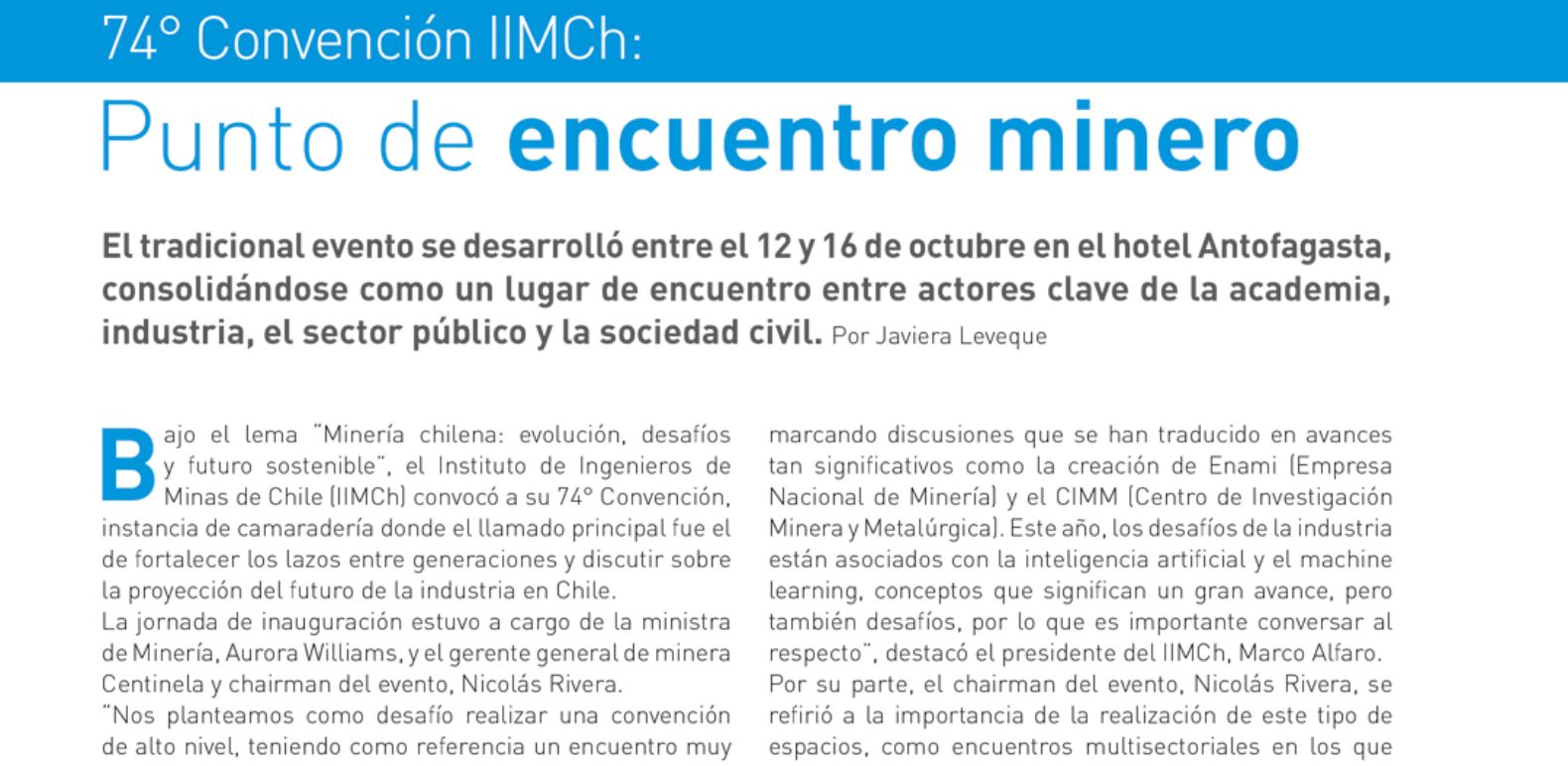 La edición de noviembre de la revista Nueva Minería y Energía dedicó un completo reportaje a la 74° Convención Anual del Instituto de Ingenieros de Minas de Chile (IIMCh), desarrollada entre el 12 y el 16 de octubre en el Hotel Antofagasta. El medio, que actúa como una de las plataformas periodísticas más influyentes del sector, profundizó en los ejes conceptuales del encuentro bajo el lema “Minería chilena: evolución, desafíos y futuro sostenible”, y recogió la visión estratégica de actores clave, entre ellos el chairman de la Convención y gerente general de Minera Centinela, Nicolás Rivera.