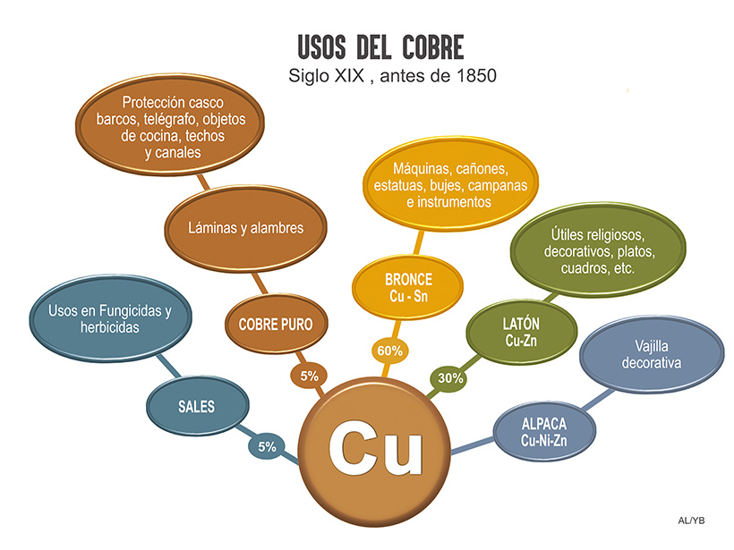 “Para completar la visión histórica que hemos visto en los capítulos pasados, presentaremos diferentes cuadros que muestran el uso del cobre en diferentes épocas con una estimación porcentual de estos”