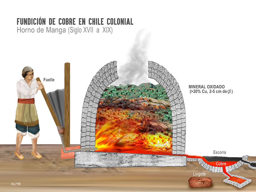 Hasta ese momento se produjo cobre exclusivamente mediante la reducción de los minerales oxidados con madera y carbón de leña en hornos de fundición desarrollados en Chile (figura 1). Estos hornos eran relativamente pequeños, de fácil instalación y la mayoría estaban dispuestos a los pies de las minas, siempre y cuando se dispusiera de madera como dispensador de energía.