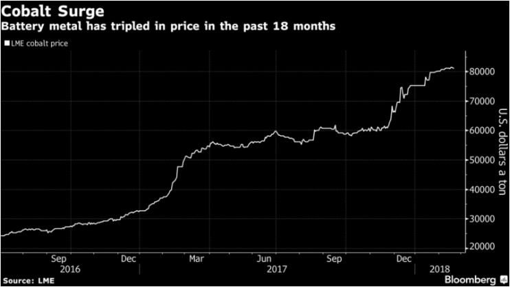 The price of cobalt has more than tripled in the past 18 months to trade above $80,000 a metric ton. Two-thirds of supplies come from the Democratic Republic of Congo, where there has never been a peaceful transition of power and child labor is still used in parts of the mining industry.