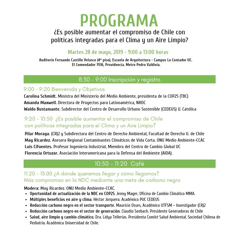 De cara a la COP25, y ante la actualización de los compromisos de Chile frente al Acuerdo de París, se presenta la oportunidad de alcanzar beneficios simultáneos de mitigar el cambio climático en el corto plazo y de resolver la grave situación de contaminación atmosférica que afecta a tantas ciudades. Este diálogo expondrá esta oportunidad, que se hace posible mediante la inclusión de una meta de mitigación del carbono negro en las NDC de chile.