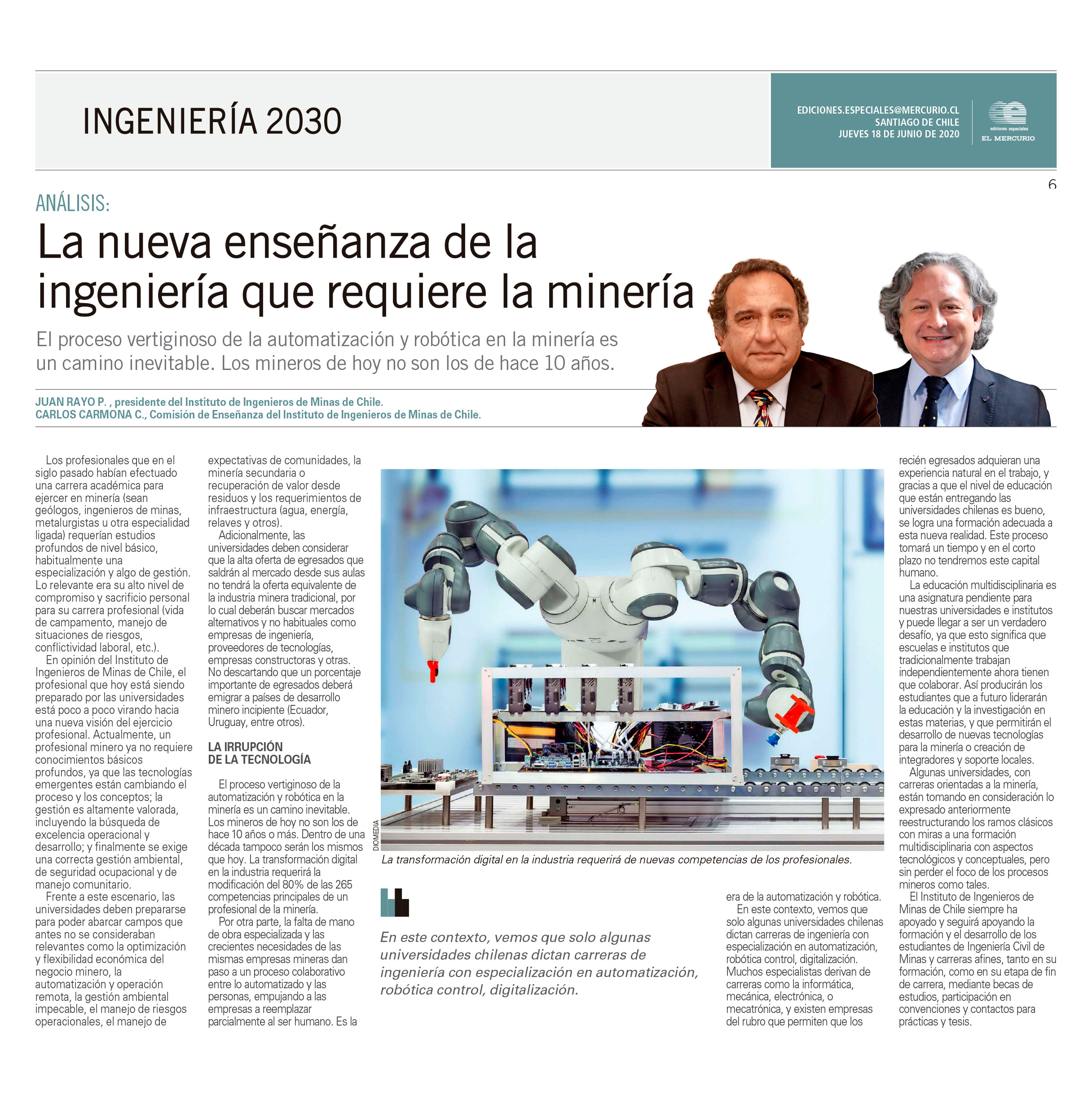El Presidente del Instituto de Ingeneros de Minas, Sr. Juan Rayo, junto a Carlos Carmona, director del IIMCh realizaron una analisis profundo sobre la enseñanza de la ingeniería que requiere la minería. La columna fue publicada en el Diario El Mercurio, si desea leerla completa, haga click AQUI.