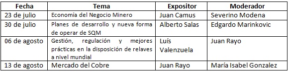 El programa contempla mantener la periodicidad semanal de dicha actividad, existiendo a la fecha los siguientes expositores confirmados, según el siguiente detalles: