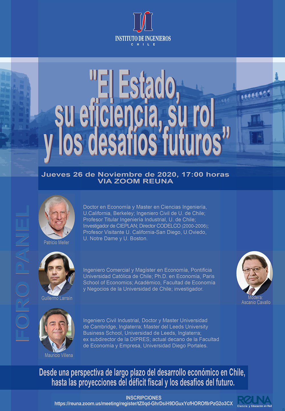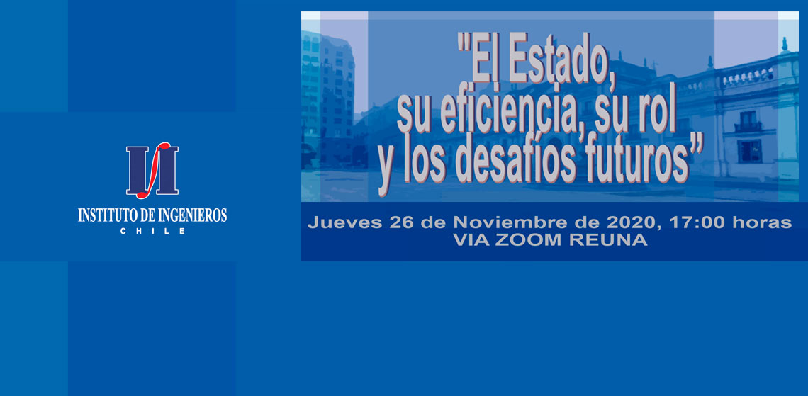Ricardo Nicolau del Roure, Presidente del Instituto de Ingenieros de Chile, tiene el agrado de enviar a usted una invitación para participar en el foro "El Estado, su eficiencia, su rol y los desafíos futuros." que se realizará el jueves 26 de noviembre de 2020 a las 17:00 horas, vía Zoom Reuna.