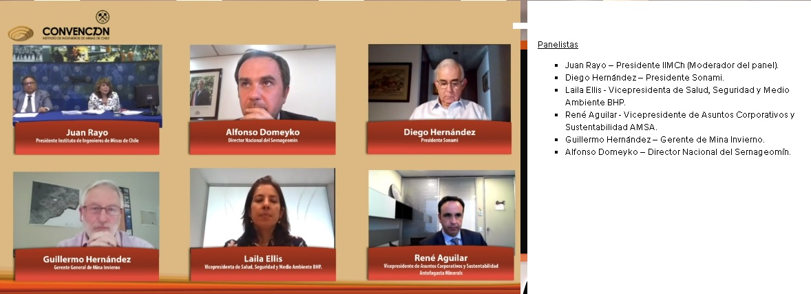 Quienes participaron del panel fueron: Diego Hernández, presidente de SONAMI; Laila Ellis, vicepresidenta de salud, seguridad y medio ambiente en BHP; Rene Aguilar, vicepresidente de asuntos corporativos y sustentabilidad en Antofagasta Minerals; Guillermo Hernández Gerente General de Mina Invierno; Alfonso Domeyko, director nacional del Sernageomin.