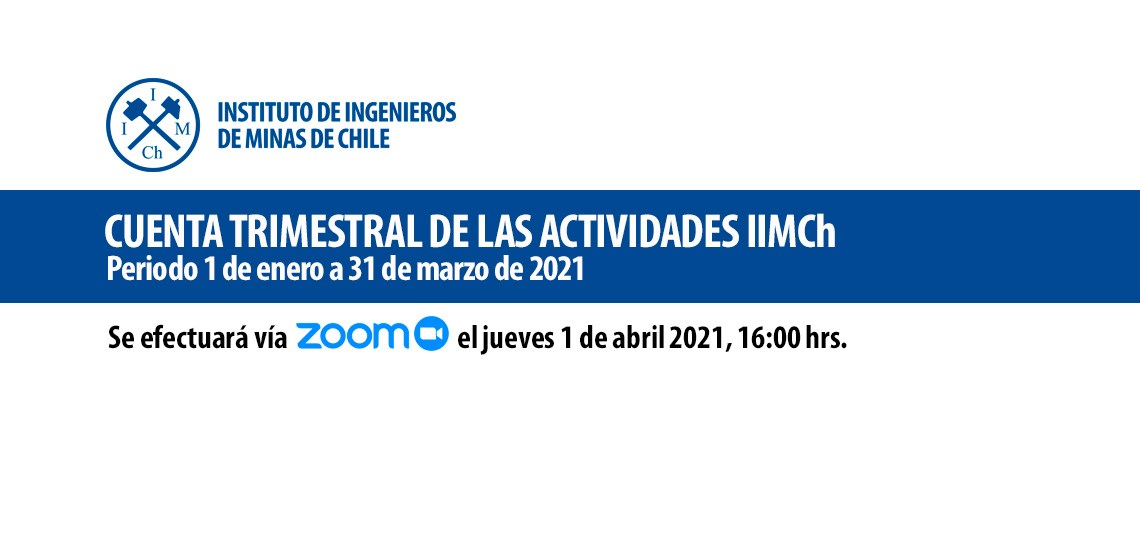 El jueves 1 de abril a las 16:00 horas, se realizará la cuarta cuenta trimestral del Instituto de Ingenieros de Minas de Chile. La información que se entregará abarca los meses de enero, febrero y marzo del 2021.