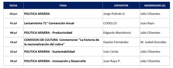 Cada mes este informativo publica el programa de jueves mineros que el Instituto a ha venido desarrollando semana a semana en forma on line y que ha permitido presentar interesantes y variados temas relacionados con la minería.