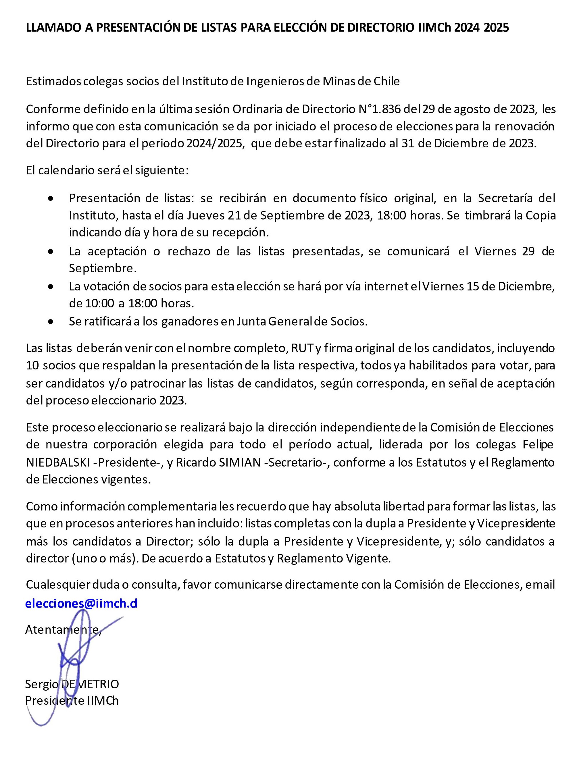 LLAMADO A PRESENTAR LISTAS PARA ELECCIÓN DE DIRECTORIO IIMCh 2024 2025
