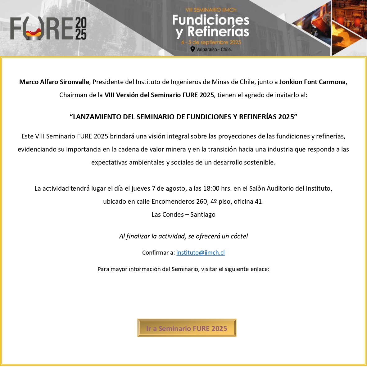 Invitación Lanzamiento FURE_2025 - Jueves 7 de agosto, a las 18:00 hrs. IIMCh al día Previous Article Ver en Vivo - Lanzamiento FURE_2025 - Jueves 7 de agosto, a las 18:00 hrs. Next Article Conoce a los ganadores del sorteo de entradas para el Net Zero Mining Forum Solutions 2025 Typography Smaller Small Medium Big Bigger Default Helvetica Segoe Georgia Times Reading Mode Share This Previous Article Ver en Vivo - Lanzamiento FURE_2025 - Jueves 7 de agosto, a las 18:00 hrs. Next Article Conoce a los ganadores del sorteo de entradas para el Net Zero Mining Forum Solutions 2025