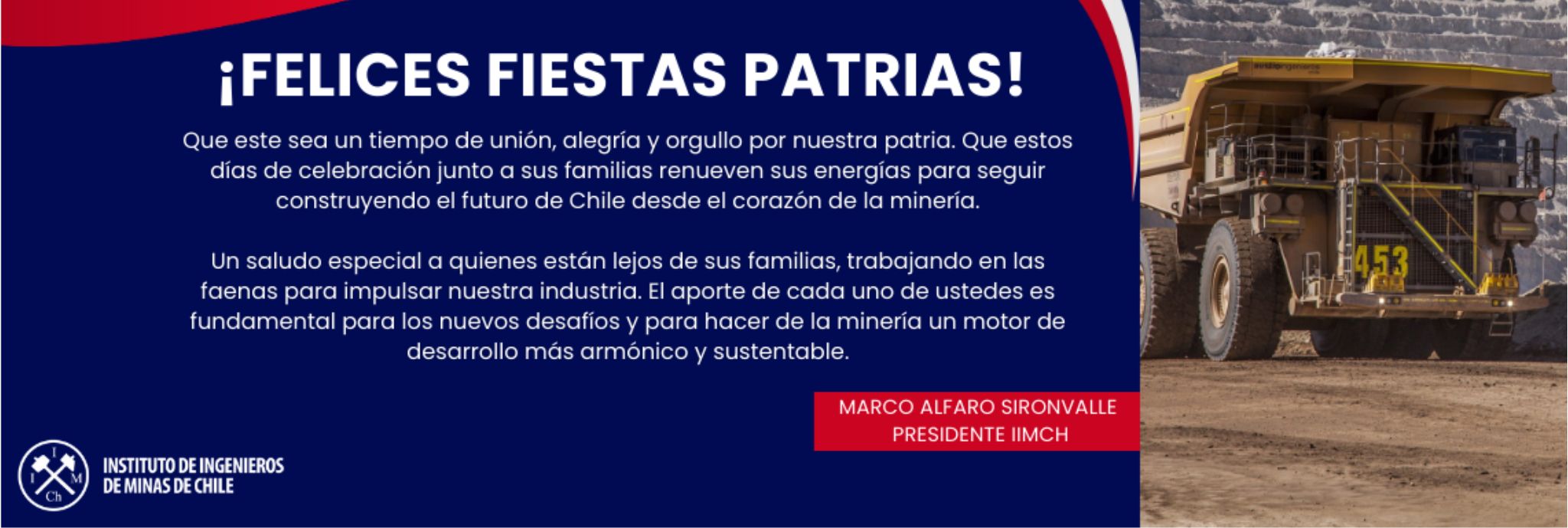 En el marco de la celebración de un nuevo 18 de septiembre, el Instituto de Ingenieros de Minas de Chile (IIMCh) hace llegar un afectuoso saludo a todos sus socios, profesionales, colaboradores y amigos, reafirmando su compromiso con la minería y con el desarrollo del país.