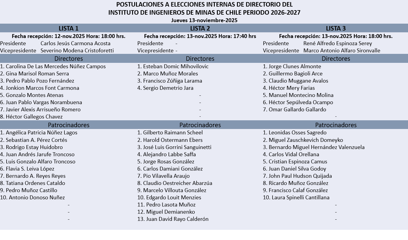 Con dos candidatos a presidente se realizará el proceso de renovación de directiva del Instituto de Ingenieros de Minas de Chile para el período 2026-2027.