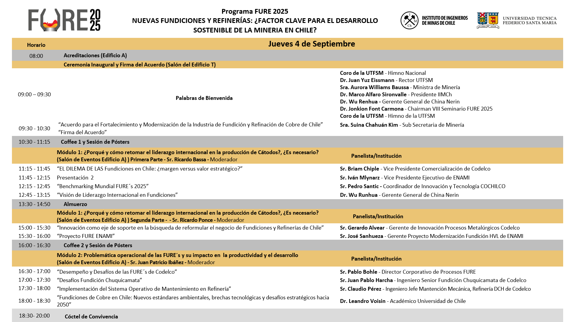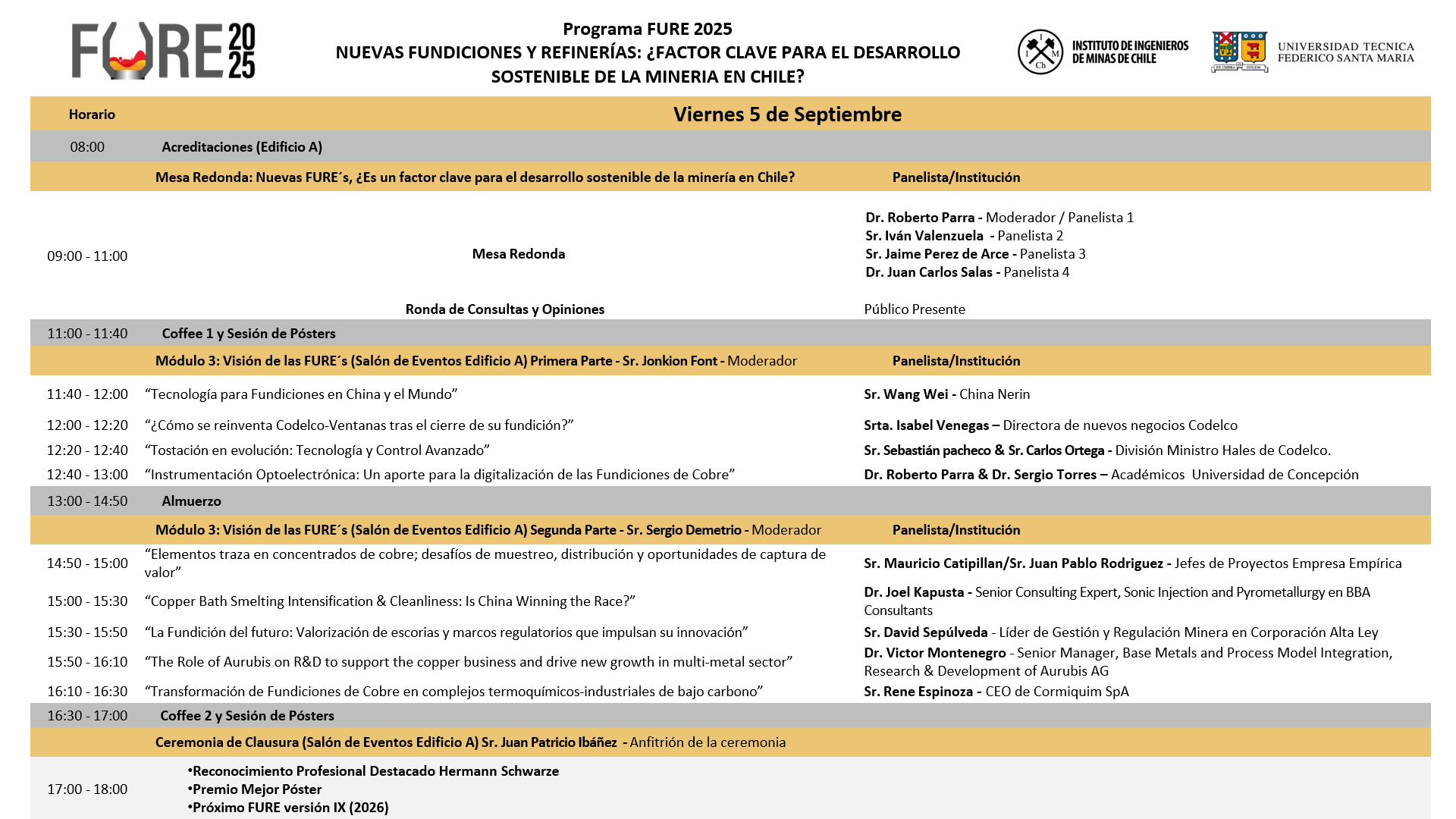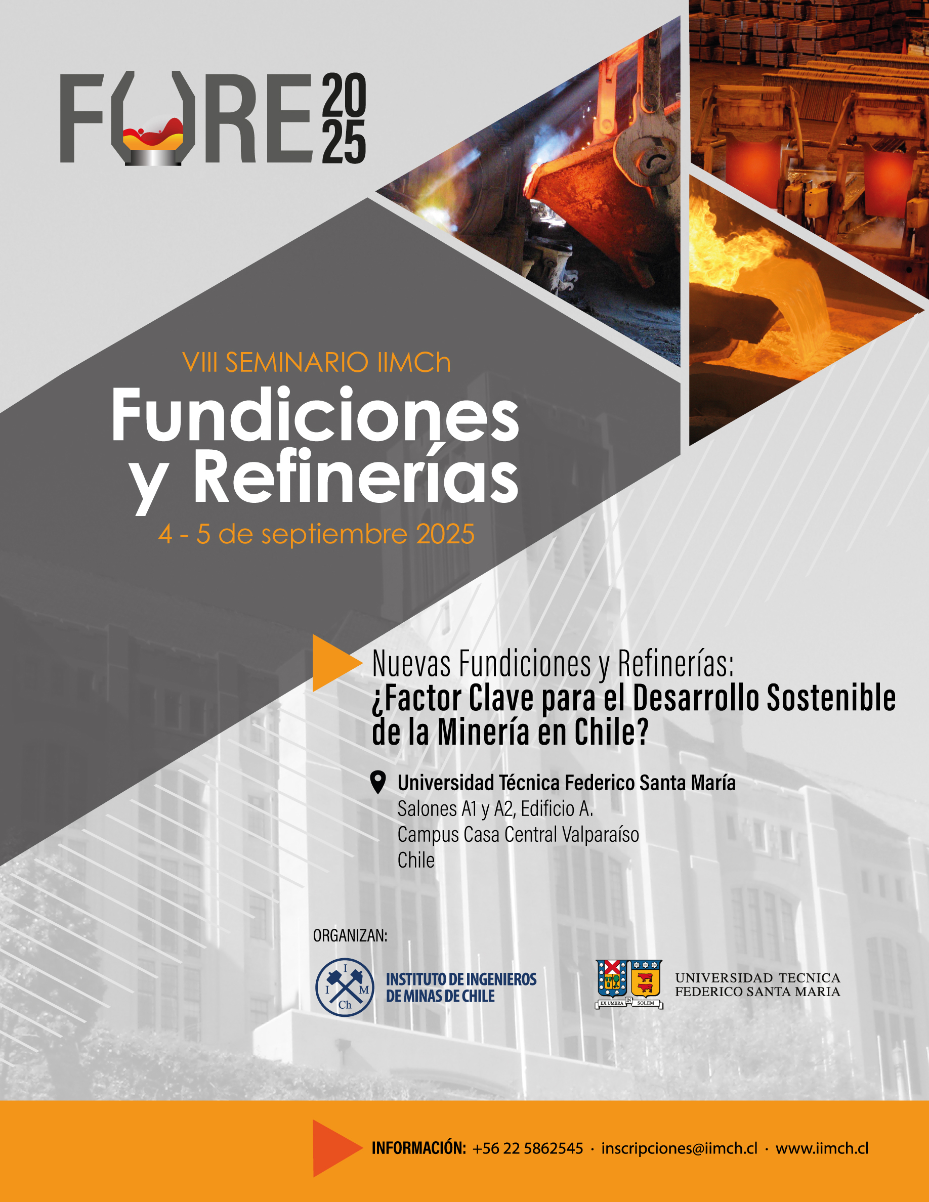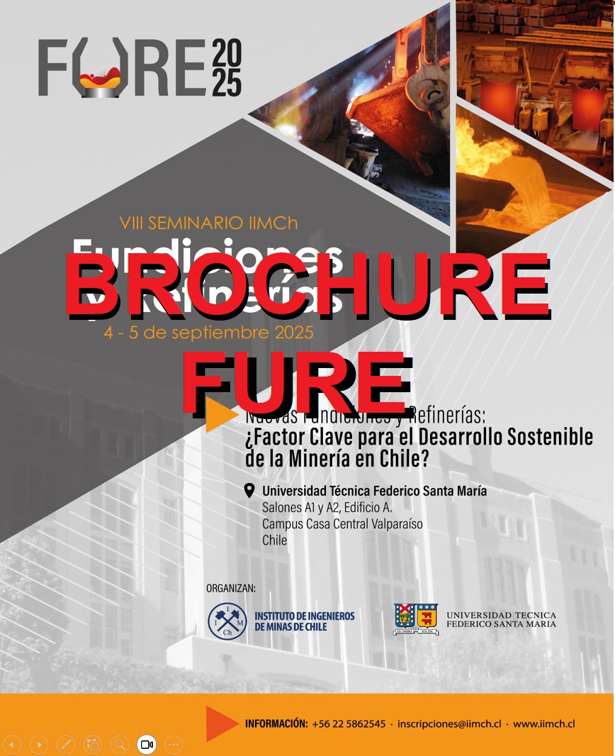 El Instituto de Ingenieros de Minas de Chile (IIMCh), en conjunto con la Universidad Técnica Federico Santa María, llevarán a cabo la VIII versión del Seminario de Fundiciones y Refinerías (FURE) los días 4 y 5 de septiembre de 2025, en el Campus Casa Central de la universidad, ubicado en Av. España 1680, Valparaíso.